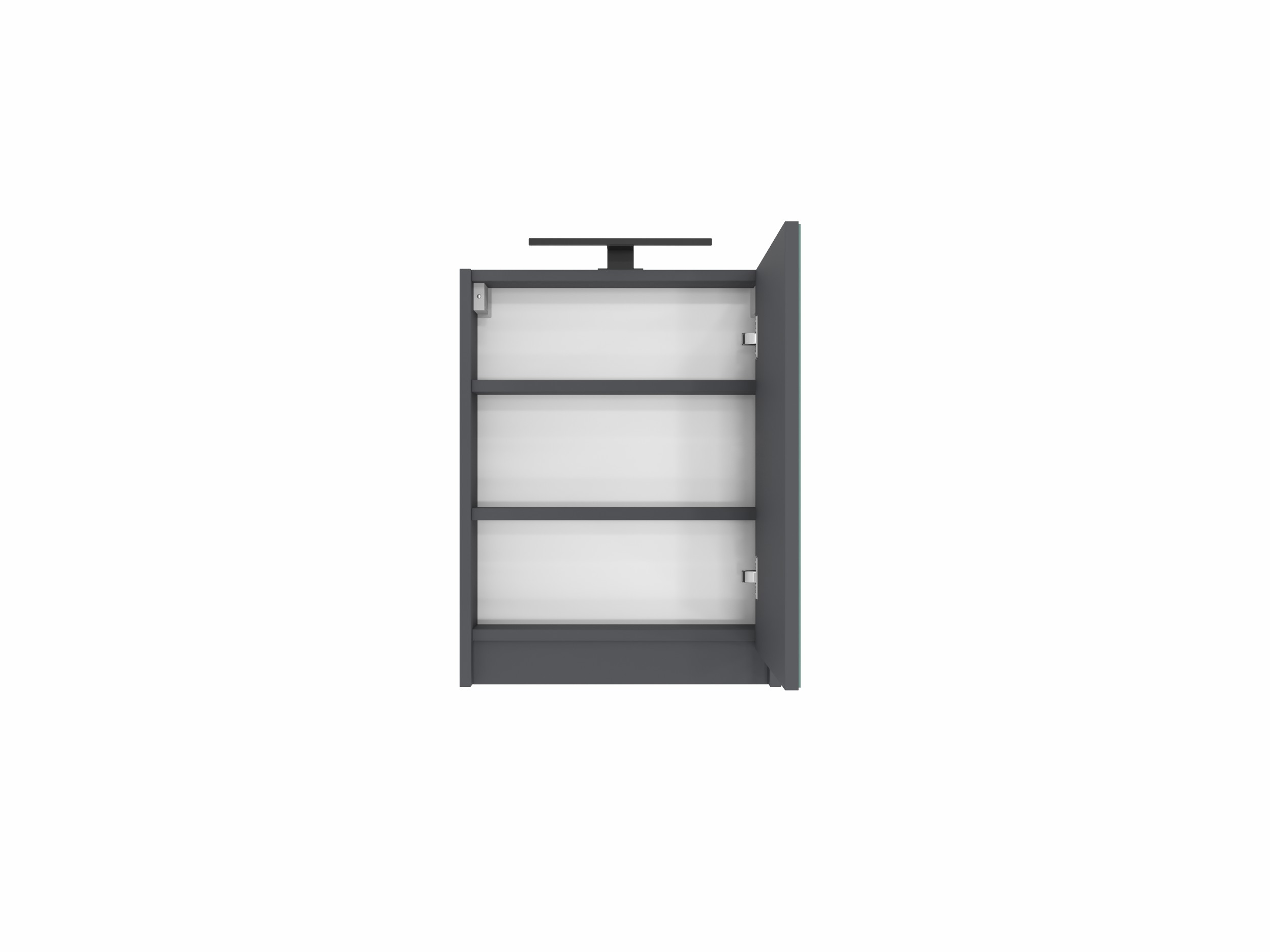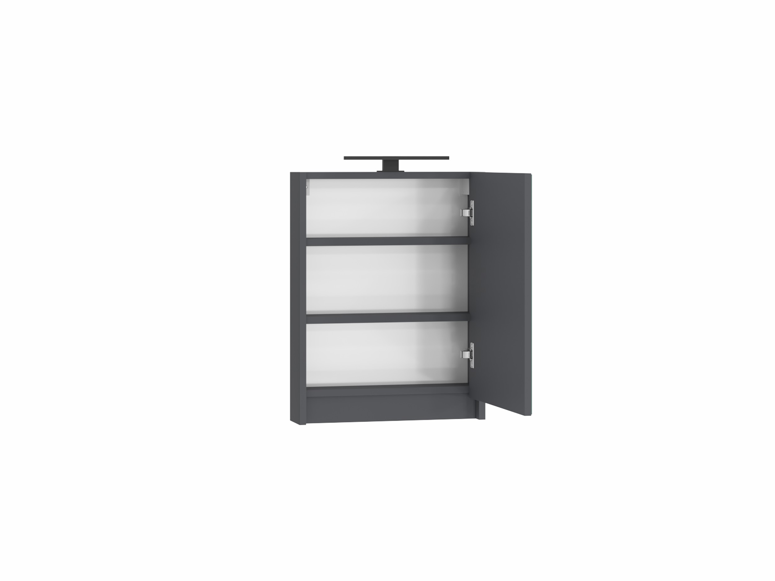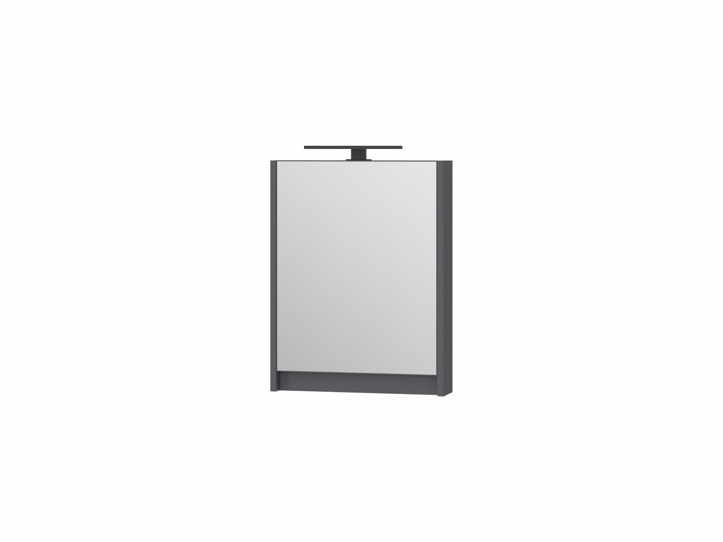 Дзеркальна шафа має одне відділення, розділене двома полицями з ДСП, за одними дверцятами на які наклеєне дзеркальне полотно. В комплекті є LED світильник та кнопка-вимикач. Компактне сховище потрібних речей.