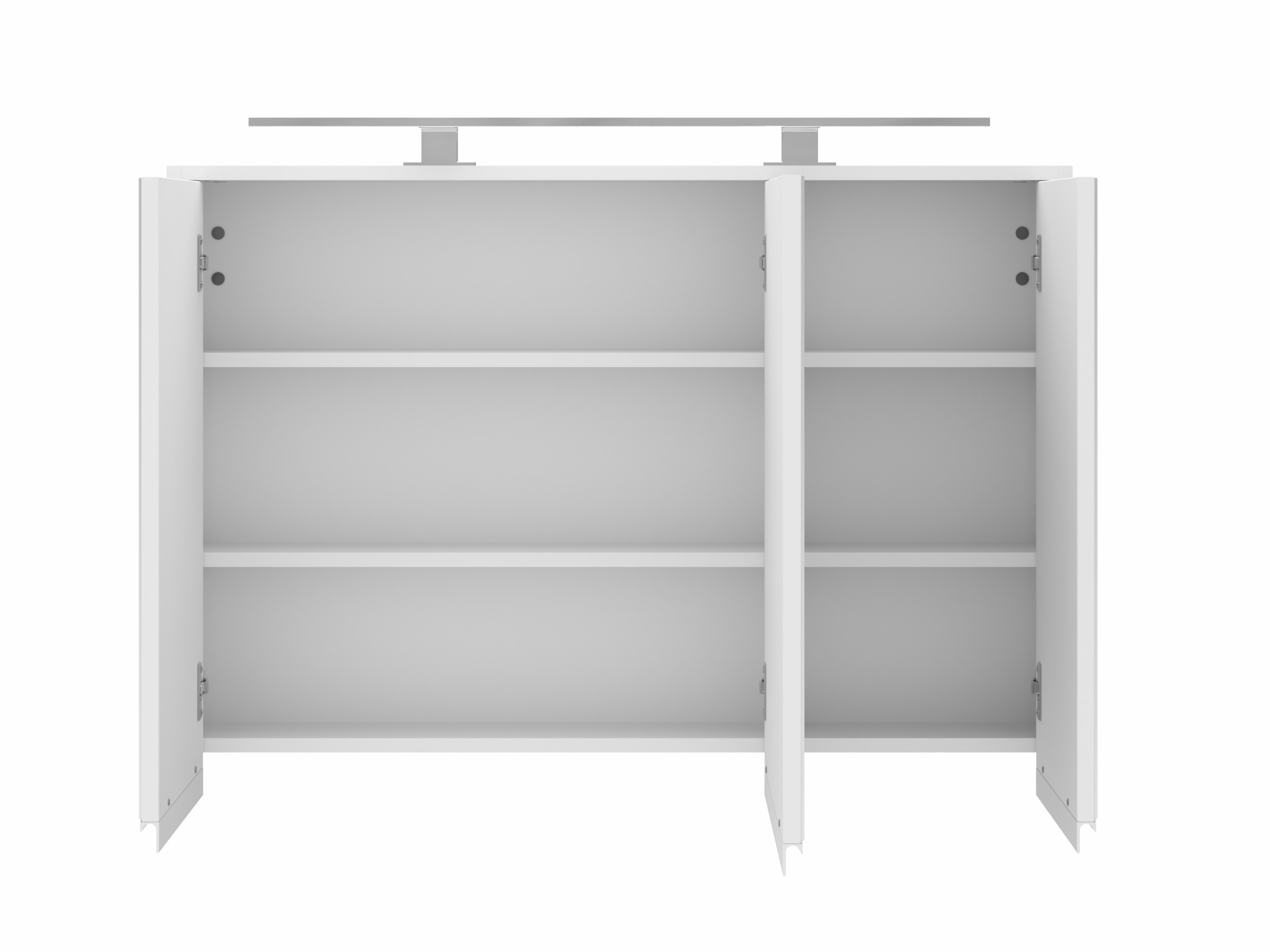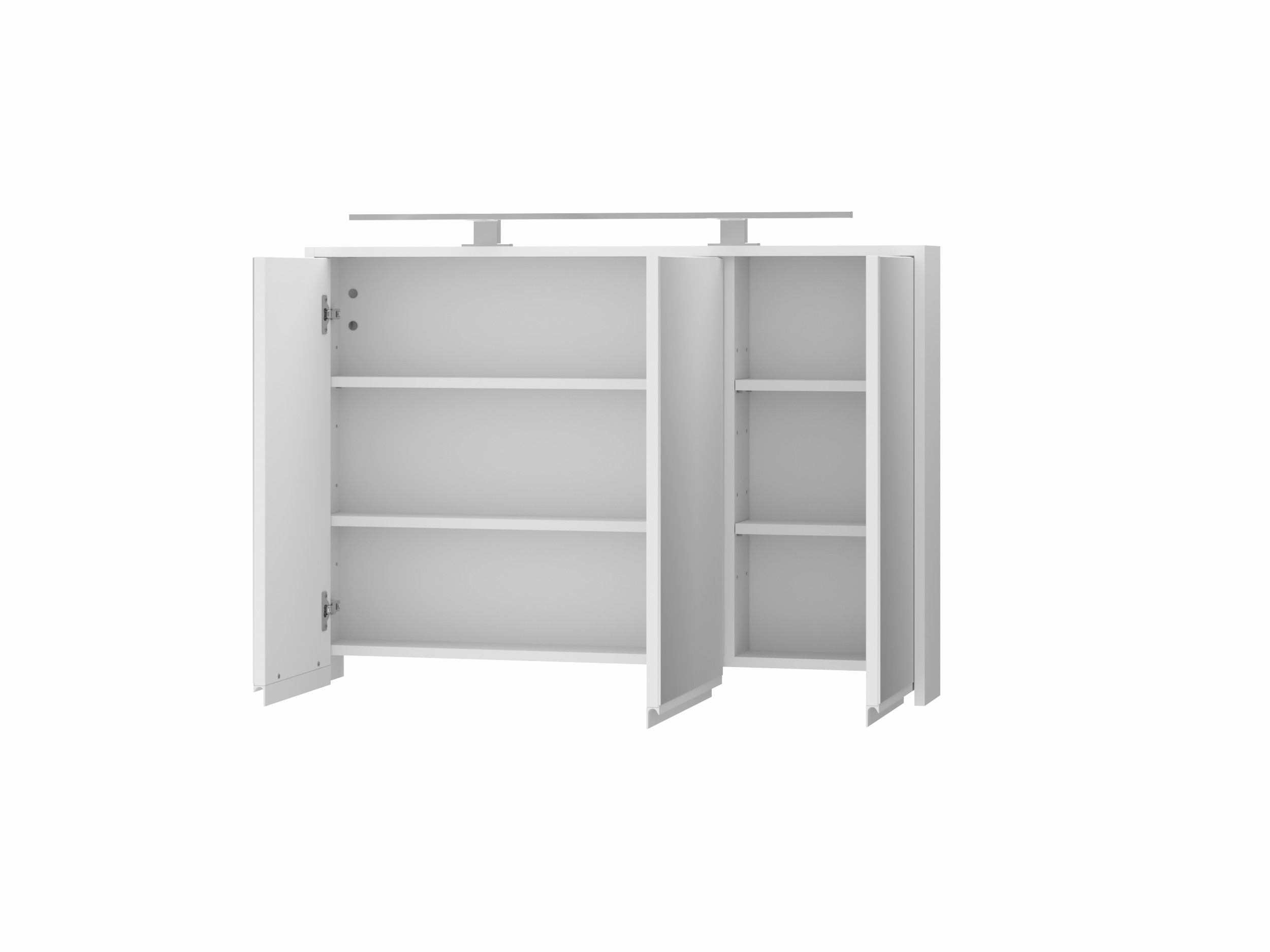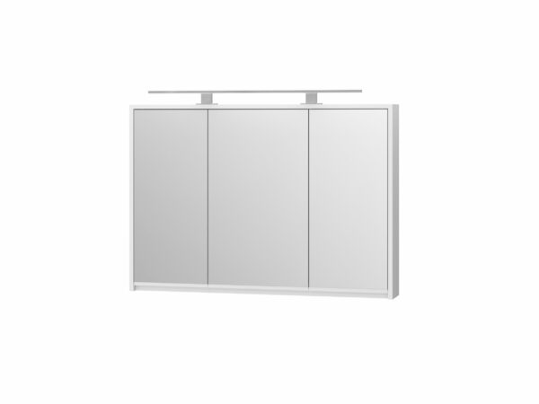Дзеркальна шафа має одне відділення, розділене двома полицями з ДСП, за двома дверцятами на які наклеєне дзеркальне полотно. В комплекті є LED світильник. Всі необхідні приладдя сховані та завжди доступні.