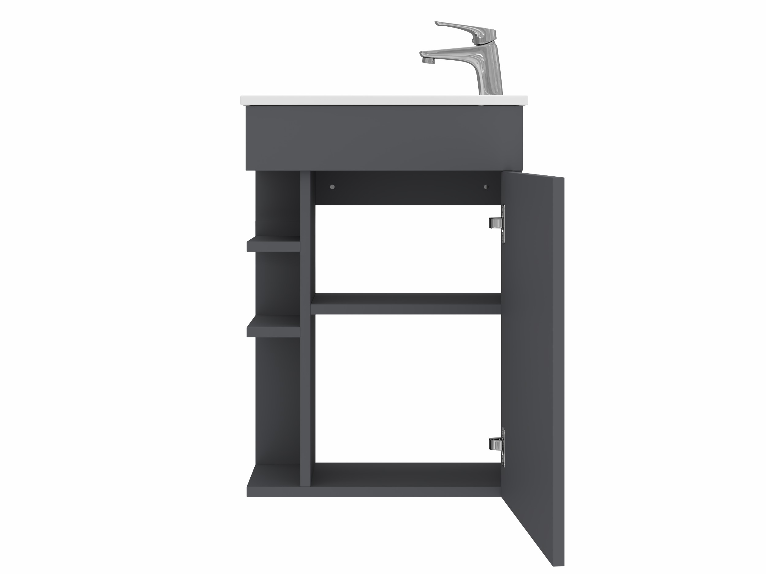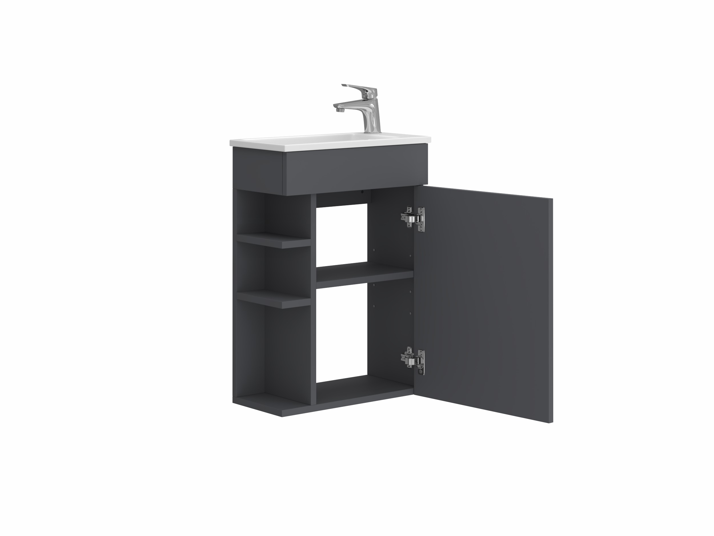 Навісна тумба з керамічним умивальником і дверцятами з функцією плавного закривання праворуч, відкритими поличками ліворуч. Максимум фунціоналу для маленьких санвузлів.