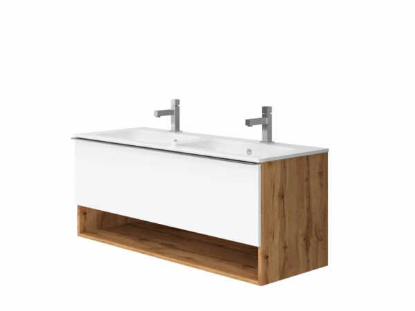 Навісна тумба з умивальником зі штучного каменю та шуфлядою з функцією самодотягування та плавного закривання. Неповторний дизайн та фунціональність. Умивальник має дві раковини. Ідеально для великої сім’ї.