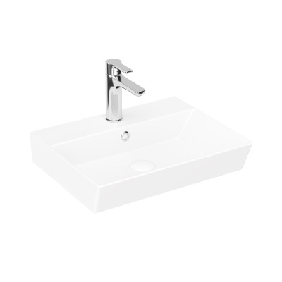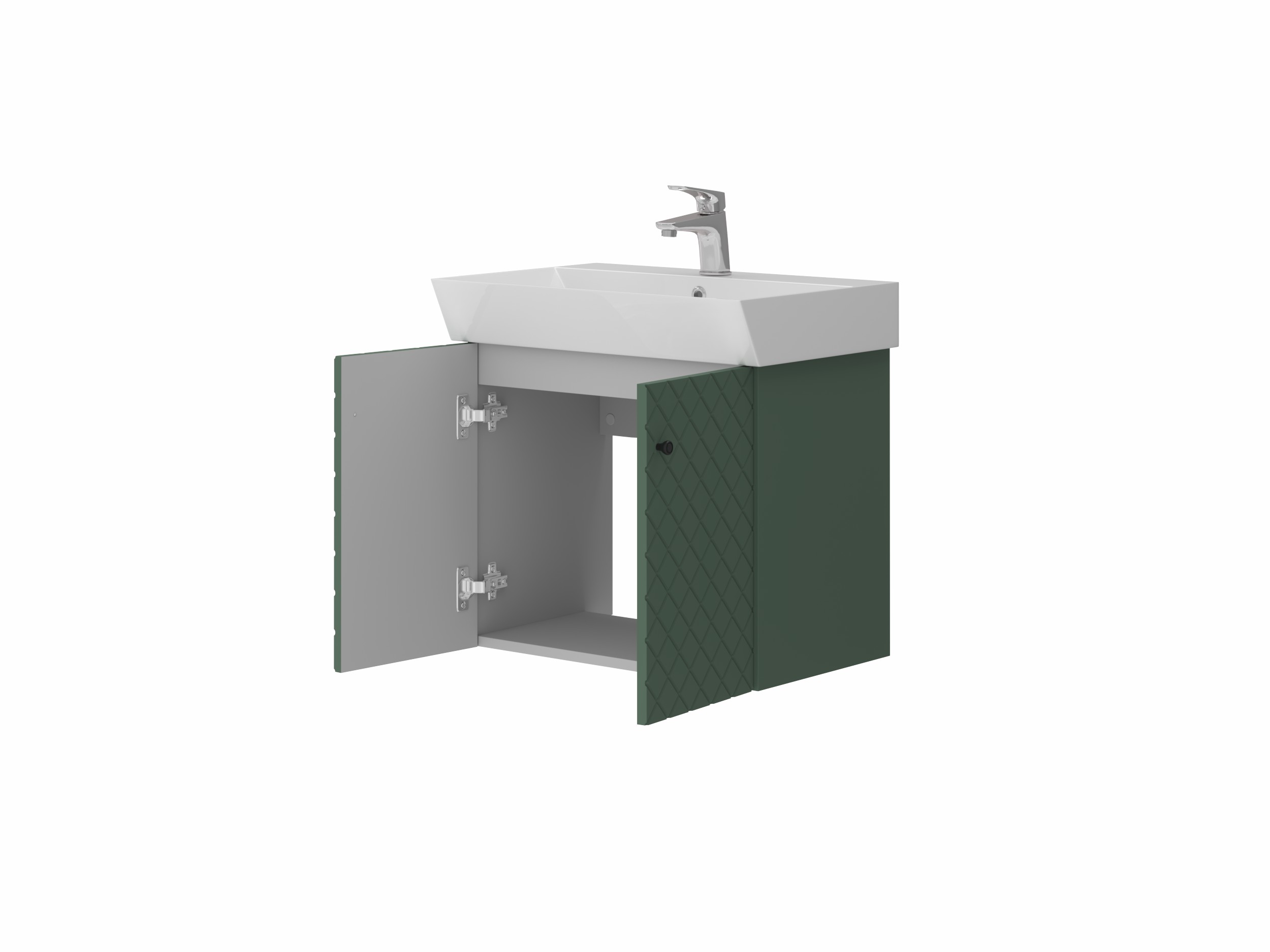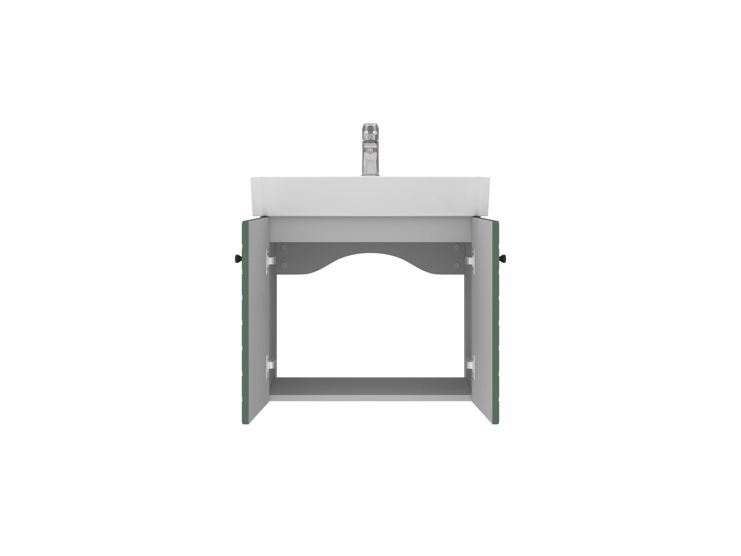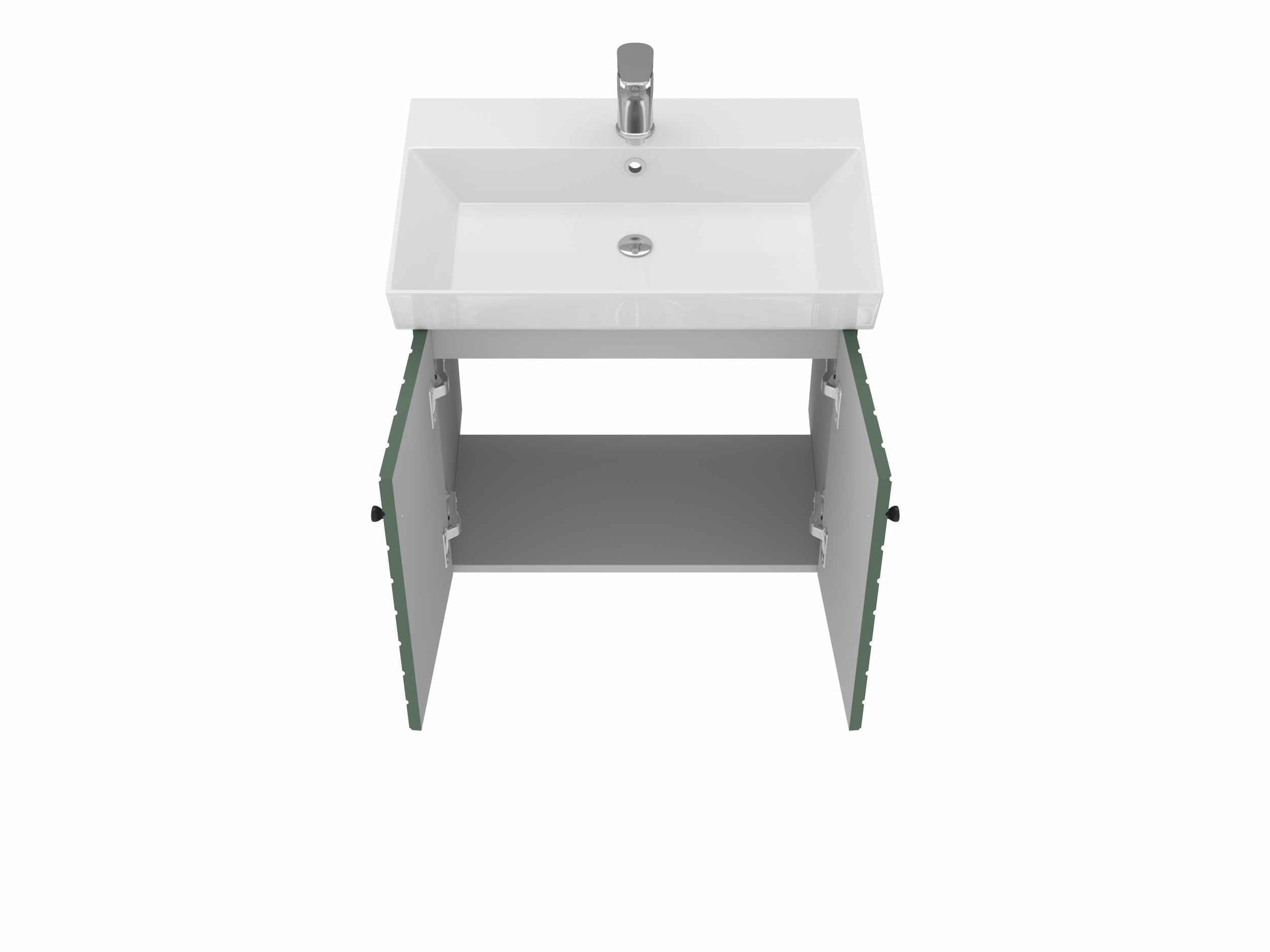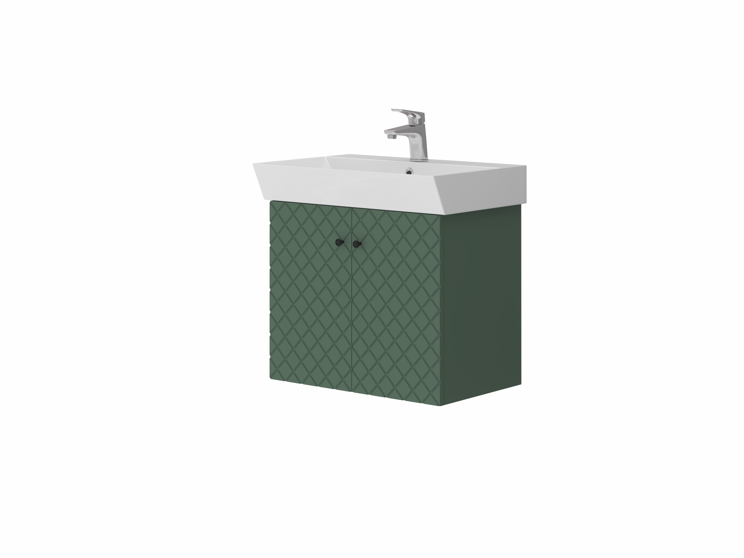 Навісна тумба з керамічним умивальником і дверцятами з функцією плавного закривання. Фасадні частини з МДФ та додатково захищені від вологи плівкою. Просто, оригінально та надійно.