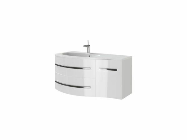 Навісна тумба з умивальником зі штучного каменю, з дверкою та двома шуфлядами з функцією самодотягування та плавного закривання. Матеріал – МДФ, неповторне виконання. Статусний продукт.